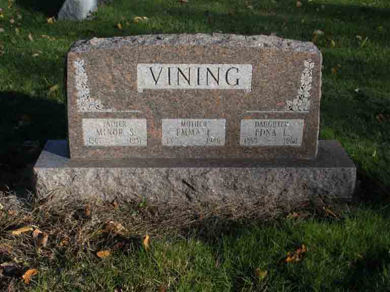 Headstone for Minor Simon/Simeon Vining, Emma F. (Dillingham) Vining, and daughter Edna L. Vining, in IOOF Cemetery, Bourbon, Marshall County, Indiana (from Find A Grave):