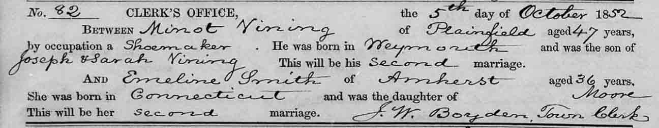 ← Back to Minot T. Vining - (1) Hannah Stowell, (2) Mrs. Emeline Smith (née Moore)