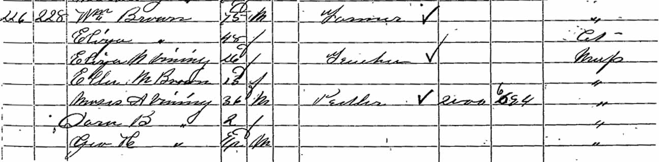 1860 Southwick, Hampden County, Massachusetts - dwelling 226, family 228. In 1860, Moses A. Vining, wife Eliza, daughter Dora, and son George were living in the household of William Brown.:
