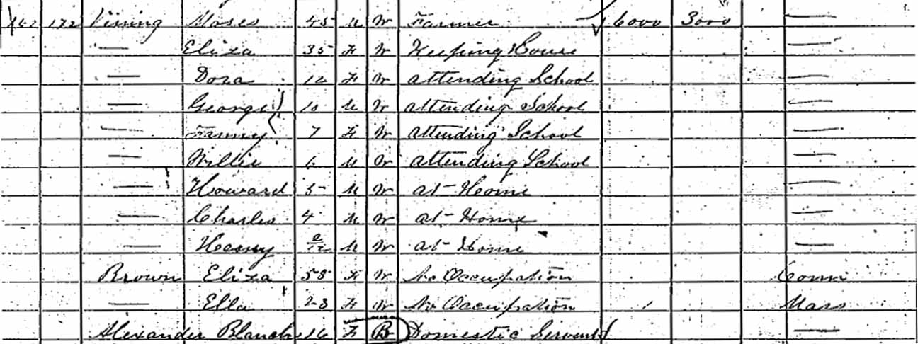 1870 Southwick, Hampden County, Massachusetts - dwelling 162, family 172. Also living in this household in 1870 were Eliza Brown (58 y., b. Connecticut), Ella Brown (23 y., b. Massachusetts), and Alexander Blan[...?] (16 y., b. Massachusetts, domestic servant).: