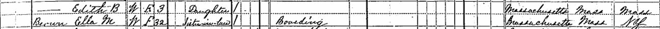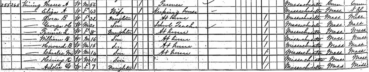 1880 Southwick, Hampden County, Massachusetts - Also living in this household in 1880 was Ella M. Brown (32 y., b. Massachusetts), a sister-in-law of Moses Andrew Vining.:
