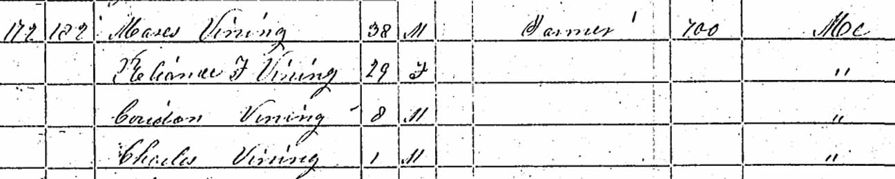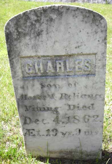 According to the 1850 census, the age of Charles Vining, son of Moses P. Vining and Reliance T. (Soule) Vining, was 1 year. This is consistent with the 1860 census report of 10 years for his age. (Census records are often approximations of true ages.) His gravestone, however, reported his age at death (4 December 1862) to be 19 years and 9 months. This would have made Charles approximately 7 years old in 1850 and around 17 in 1860. Clarification is needed here.← Back to Moses P. Vining - (1) Reliance T. Soule, (2) Clarinda [Briggs?]