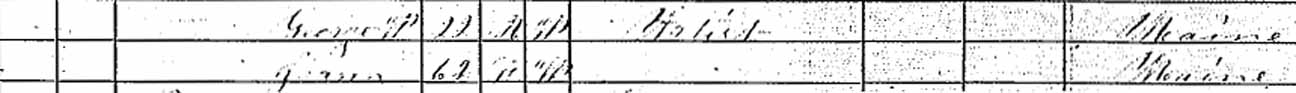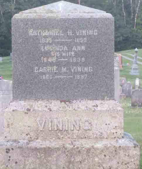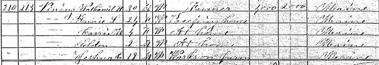 1870 St. Albans, Somerset County, Maine - dwelling 210, family 213. Also living in this household in 1870 were two nephews of Nathaniel Haws Vining—Joshua C. Vining (19 y., b. Maine, "works on farm") and George W. Vining (22 y., b. Maine, artist)—and his mother, Joann Vining (62 y., b. Maine).: