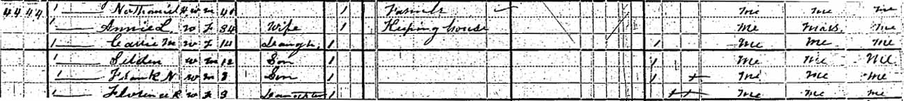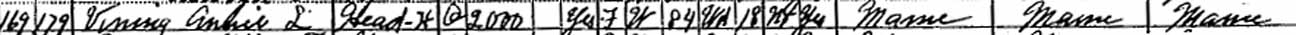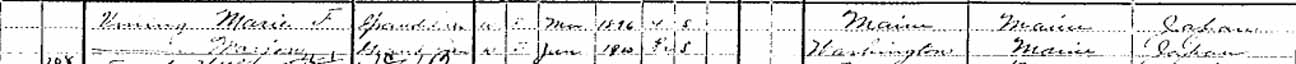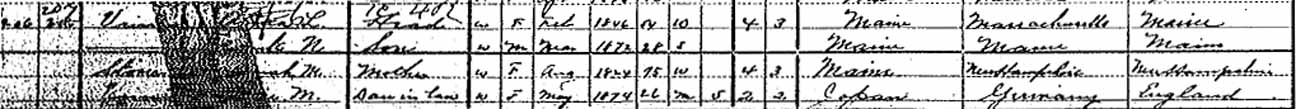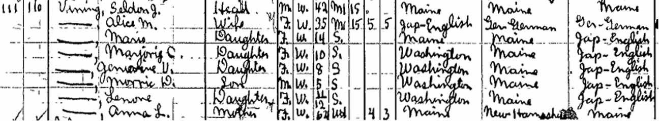 1900 St. Albans, Somerset County, Maine - dwelling 206, family 207. Also living in this household in 1900 was [...] M. Stone (Anna L. (Stone) Vining's mother). Alice (Lowenstein) Vining (the wife of Seldon J. Vining and daughter-in-law of Nathaniel Haws Vining and Anna L. (Stone) Vining) and her two daughters (Marie Thelma Vining and Marjorie C. Vining) were reported in this St. Albans household in 1900 as well as in the household of (and with) Seldon J. Vining in Seattle (ward 8), King County, Washington.: