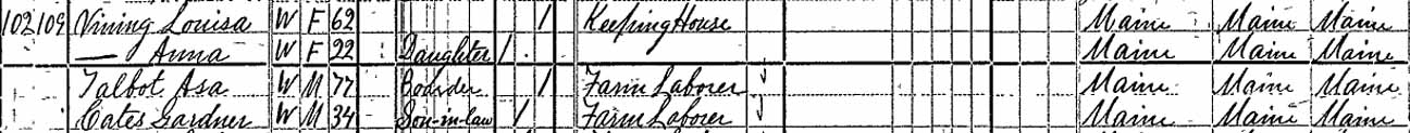 1880 Avon, Franklin County, Maine - dwelling 102, family 109. Also living in this household in 1880 were Asa Talbot (boarder, 77 y., b. Maine) and Gardner Cates (son-in-law, 34 y., b. Maine). Note that Gardner Cates's wife, Sarah Jane Vining, was not living in this household in 1880.: