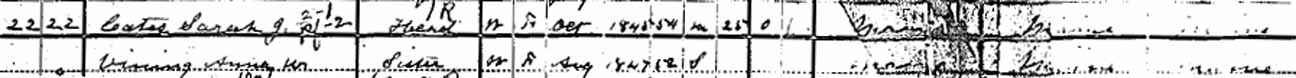 1900 Avon, Franklin County, Maine - dwelling 22, family 22. Sarah Jane (Vining) Cates and Roxanna W. Vining were living together in 1900. The birth date and age of the latter is off by 10 years in this census record.: