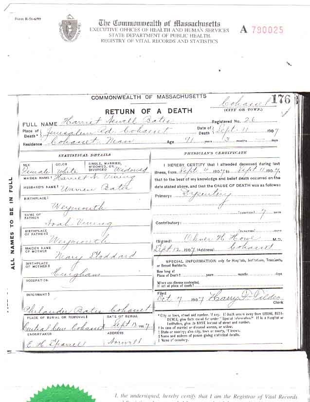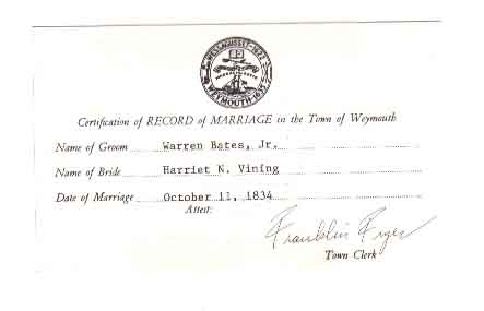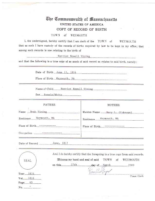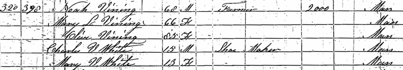 1850 Weymouth, Norfolk County, Massachusetts - dwelling 320, family 398. Also living in this household in 1850 were Olive Vining (85 y., b. Massachusetts), Charles V. White (15 y., b. Massachusetts, shoemaker), and Mary V. White (13 y., b. Massachusetts), the latter two likely grandchildren of Noah and Mary (Stoddard) Vining.: