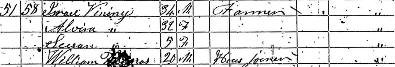 1870 Wilton, Franklin County, Maine - dwelling 5, family 6. In 1870, Susan Thomas Vining was married but still living in her parents' household.:
