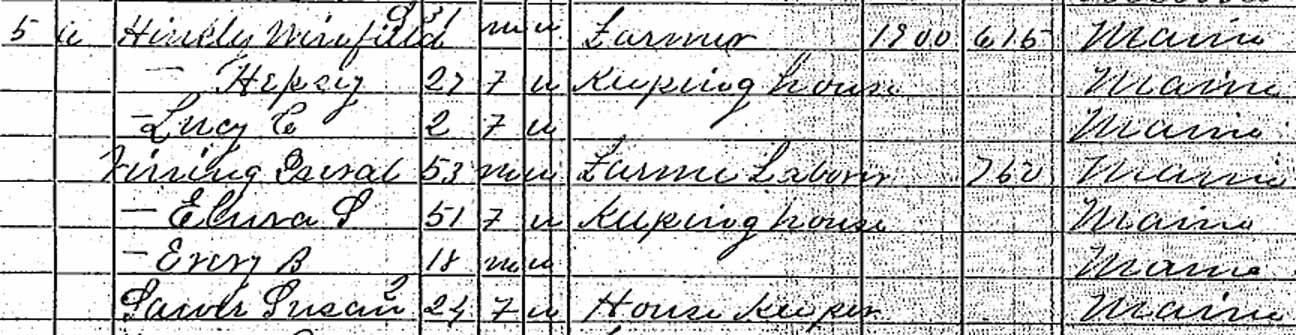 1850 Readfield, Kennebec County, Maine - dwelling 51, family 58. Also living in this household in 1850 was William Thomas (20 y., b. Maine, house joiner).: