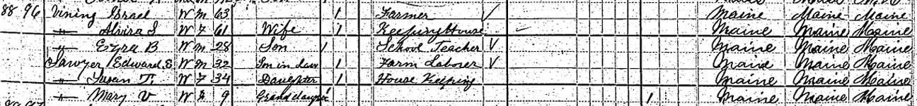 1880 Littleton, Middlesex County, Massachusetts - dwelling 88, family 96. Also living in this household in 1880 were Susan Thomas (Vining) Sawyer (daughter of O. Israel Fifield Vining and Elvira S. (Thomas) Vining), her husband (Edward S. Sawyer) and their daughter (Mary V. Sawyer).: