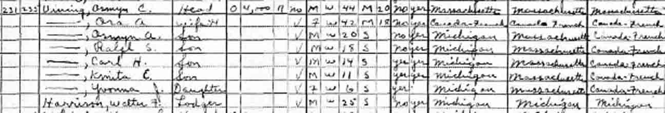 1920 Kalamazoo Township, Kalamazoo County, Michigan - dwelling 189, family 194. Also living in this household in 1920 were the parents of Osmyn Carl Vining: Osmyn Vining and Caroline A. "Carrie" (Dyer) Vining.:
