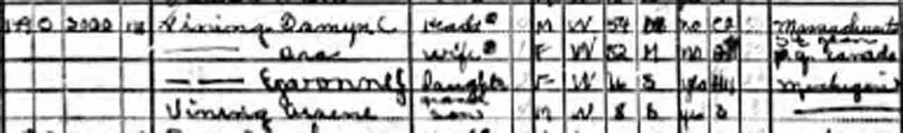 1940 Kalamazoo Township, Kalamazoo County, Michigan. Also living in this household in 1940 was Arsene Vining (8 y., b. Michigan, grandson of Osmyn Carl Vining and Aurore A. "Ora" (La Palm) Vining).:
