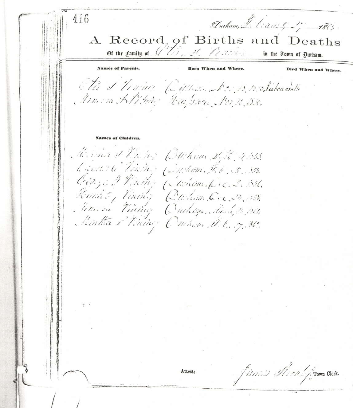The town of Durham, Androscoggin County, Maine, has photocopied its vital record books, and those photocopies are available for public viewing. Unfortunately, much of the photocopied material is very difficult to impossible to read. Below is the 27 February 1865 page (greatly enlarged) reporting the family of Otis S. Vining and Minerva A. Storer.