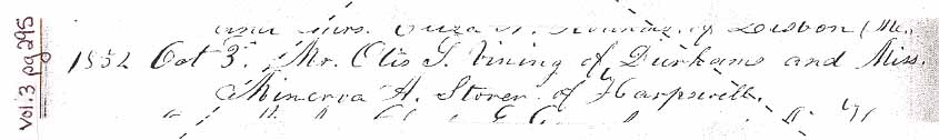 Marriage intentions of Otis S. Vining and Minerva A. Storer, from Lisbon, Maine, town records. The dashed diagonal lines showing in the marriage intentions record are placed there by the town of Lisbon to show that it is not a certified record.