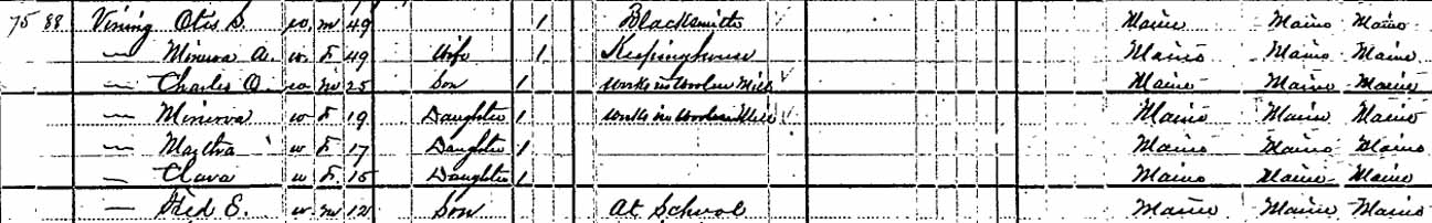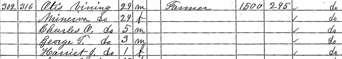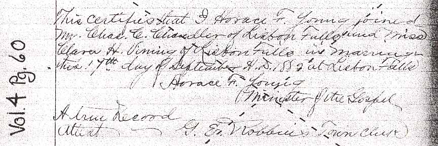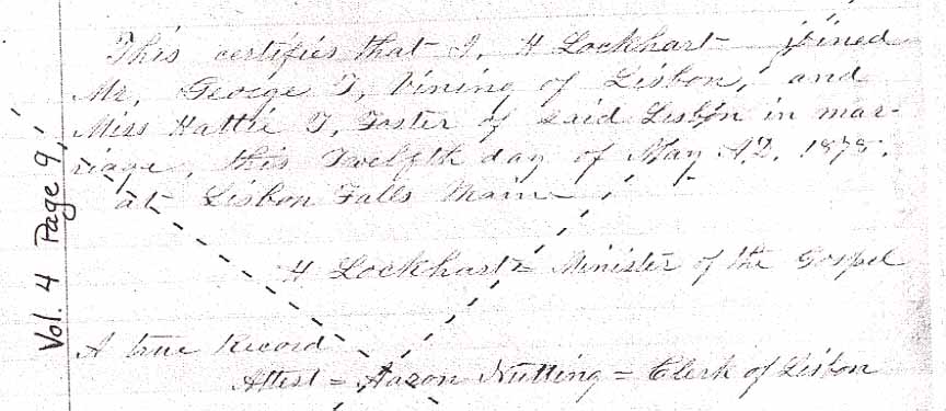 Marriage record of George Thomas Vining (son of Otis S. Vining and Minerva A. (Storer) Vining) and Hattie T. Foster, from the Lisbon, Maine, town records. The dashed diagonal lines showing in the marriage record are placed there by the town of Lisbon to show that it is not a certified record.