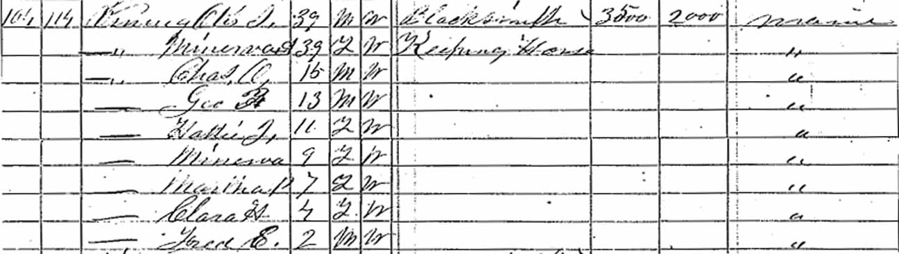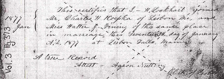 Marriage record of Harriet Jane Vining (daughter of Otis S. Vining and Minerva A. (Storer) Vining) and Charles H. Koepka, from Lisbon, Maine, town records. The dashed diagonal lines showing in the marriage record are placed there by the town of Lisbon to show that it is not a certified record.