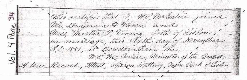 Marriage record of Martha Plummer Vining (daughter of Otis S. Vining and Minerva A. (Storer) Vining) and Benjamin F. Thorn, from Lisbon, Maine, town records. The dashed diagonal lines showing in the marriage record are placed there by the town of Lisbon to show that it is not a certified record.