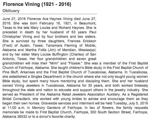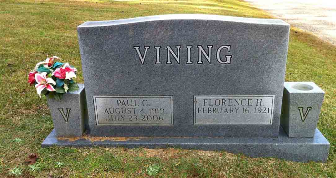 Headstone for Paul Christopher Vining and Florence (Haynes) Vining, in Memory Gardens of Fairhope, Fairhope, Baldwin County, Alabama: