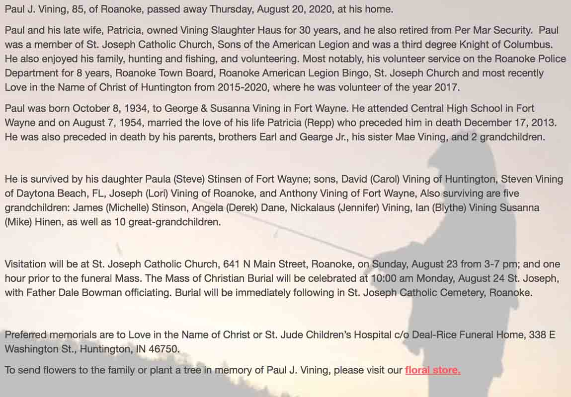 Obituary for Paul J. Vining (from website of Deal-Rice Funeral Home; Huntington, Indiana):