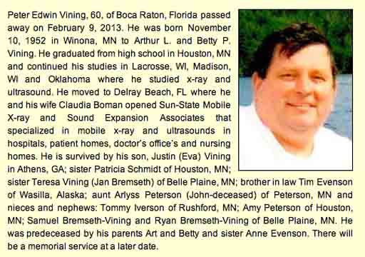 Headstone for Peter Edwin Vining and daughter Anne M. (Vining) Evenson, in Rushford Lutheran Cemetery, Rushford, Fillmore County, Minnesota (from Find A Grave):