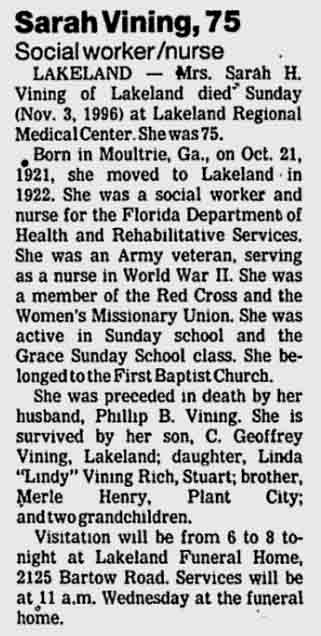 Obituary for Sarah (Henry) Vining (from Lakeland Ledger, 5 November 1996, page B4, column 6):