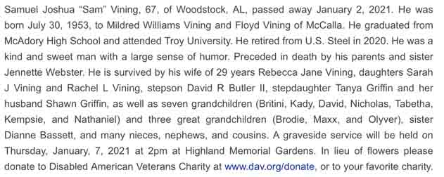 Obituary for Samuel Joshua Vining (from website of McCalla [Alabama] Memorial Funeral Home):