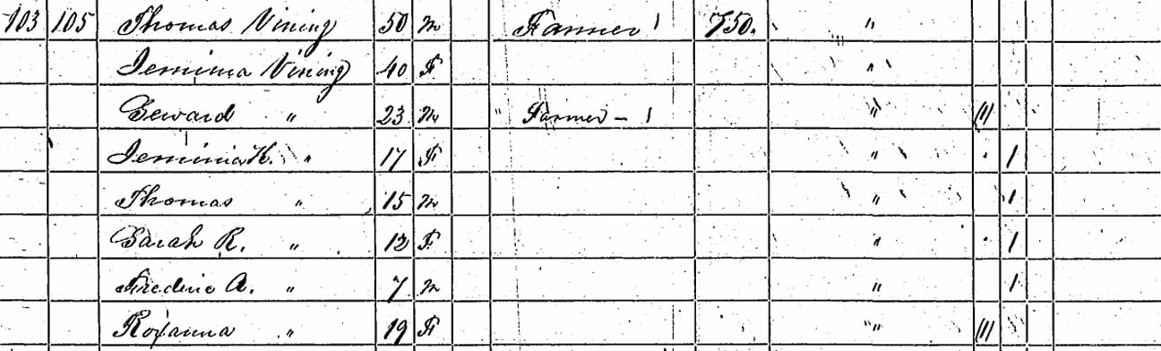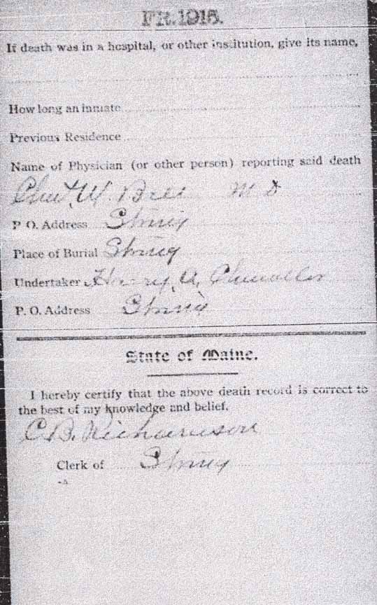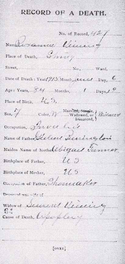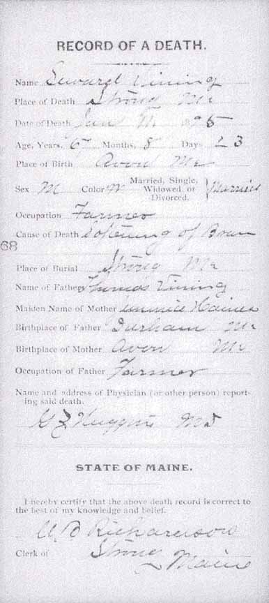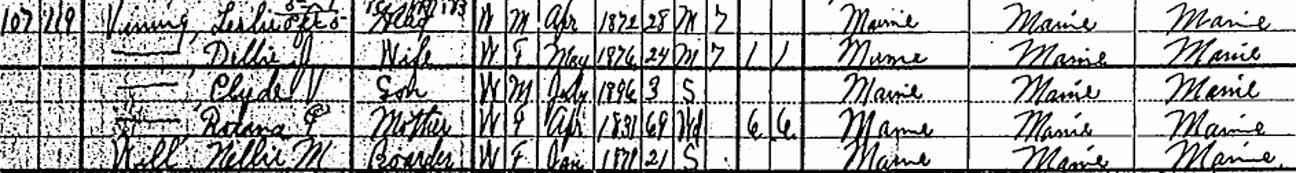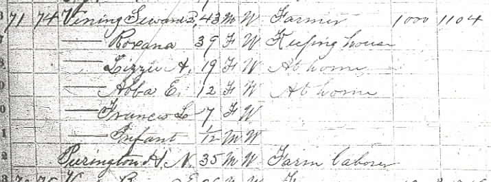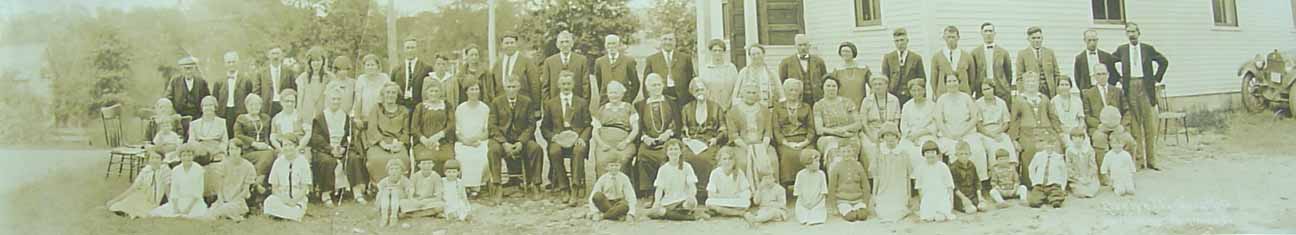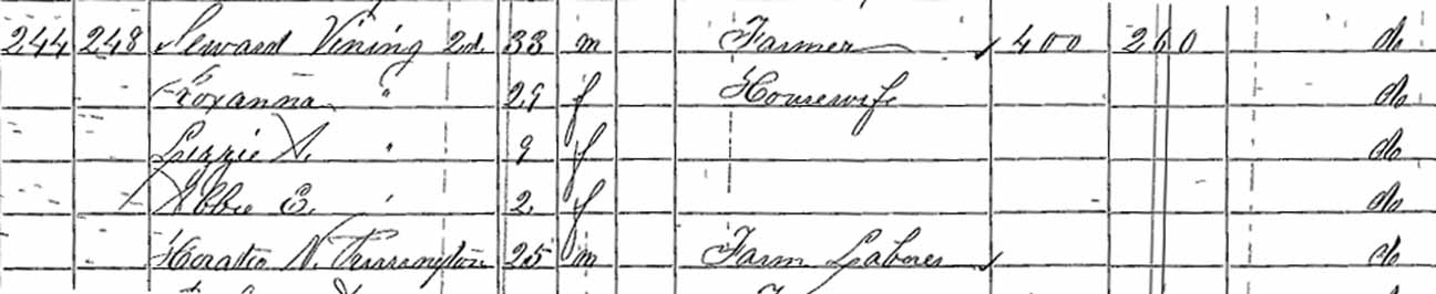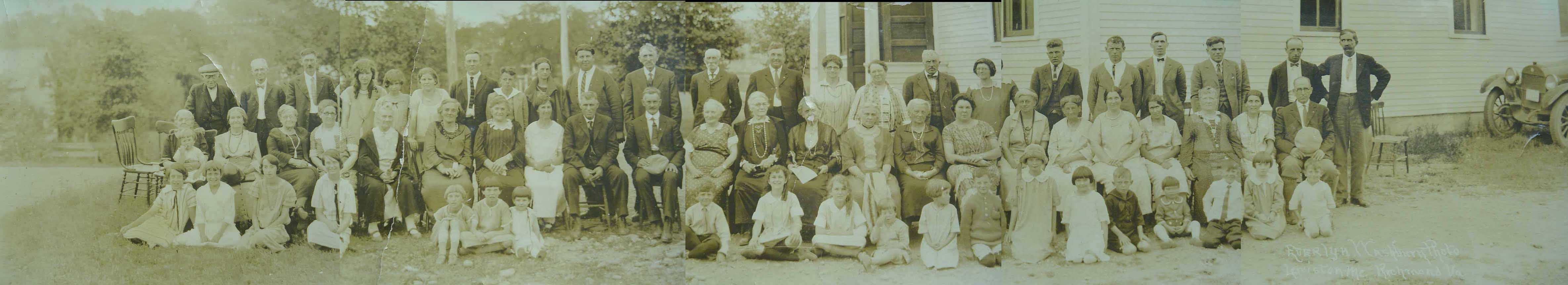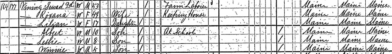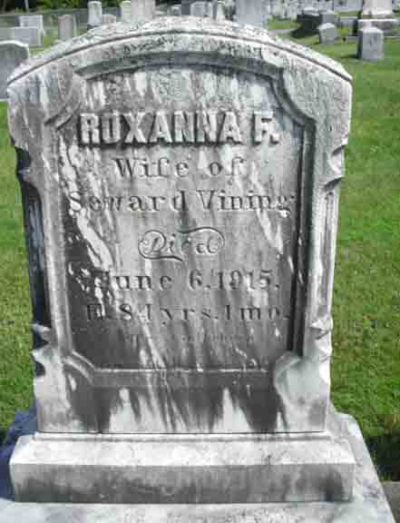 Thank you to Albert Nelson Vining Jr. for identifying people in this photograph that was in his possession as 19 June 2006. All of the people he named were descendants of Seward Vining and Roxanna F. (Purrington) Vining. His identifications were expanded using full names from the online Vining family genealogy. Information in brackets is also from the online genealogy. Back row (standing, from left to right): ?, ?, ?, ?, Christie Vining [daughter of Leslie Alvin Vining], ?, ?, ?, Albert Nelson Vining Jr. [son of Albert Nelson Vining], Helen Louise (Meserve) Vining [wife of Albert Nelson Vining], Randall O. Vining [son of Winfield R. Vining], Chester C. Allen [second husband of Lizzie A. Vining; she was the first child of Seward and Roxanna], Marcellus F. Will [husband of Abbie Evelyn Vining; she was the second child of Seward and Roxanna], Albert Nelson Vining [fourth child of Seward and Roxanna], housekeeper of Winfield R. Vining, ?, ?, Ella Amelia (Winter) Vining [wife of Leslie Alvin Vining], ?, ?, ?, ?, ?, Leslie Alvin Vining [fifth child of Seward and Roxanna]. Middle row (seated in chairs, from left to right): ?, ? [seated on lap],?, Lizzie A. (Vining) Allen [wife of Chester C. Allen], ?, ?, ?, ?, ?, ?, ?, ?, ?, ?, ?, ?, ?, ?, Abbie Evelyn (Vining) Will, ?, ?, ?, ?, Winfield R. Vining [sixth child of Seward and Roxanna]. Front row (seated/kneeling on ground, from left to right): all unknown to Albert Nelson Vining Jr.