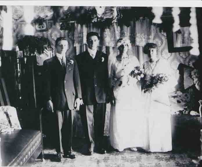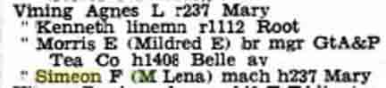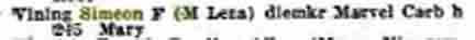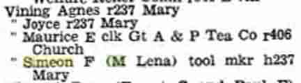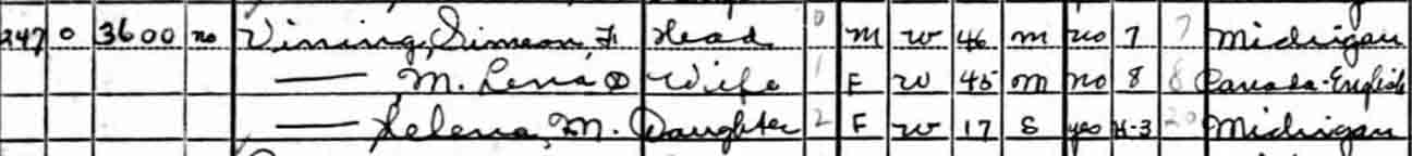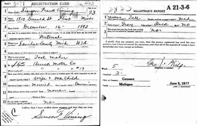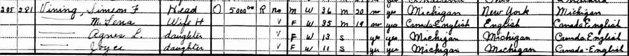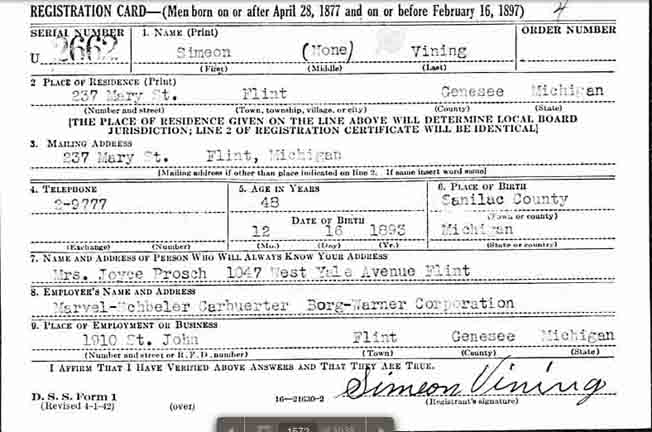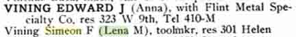 When Simeon Frank Vining was born on December 16, 1893, in Elmer, Sanilac County, Michigan, his father, Murray, was 25 and his mother, Lilly, was 21. In 1900 he was 7 years old and still living in, or near, Elmer; his father was a farmer. By 1910, when he was 17, they had moved to Columbus Township, in Luce County. He married Lena Farrow on June 2, 1914, in Flint, Michigan [see wedding photographs below]. In 1916 they lived at 301 Helen in Flint and he was employed as a toolmaker [see Flint, Michigan, City Directory entries below]. In 1917 he was working at Buick in Flint and living at 1510 Donald St. In 1924 they were living at 237 Mary Street in Flint and stayed there until about 1945, when they moved to 245 Mary Street, which is his last known address. He had three children (Agnes, Joyce, and Helena; [see photograph below]) by the time he was 28. In 1941 he was working at Marvel-Schebler Carburetor. In retirement, Simeon built a camper to place in the bed of a Dodge pickup truck, and he and Lena toured the US visiting the National Parks. He also built a cabin on Van Ettan Lake in Michigan's Iosco County that he and the family enjoyed for many years. They also had a small retirement home in Bonita Springs, Florida, for the winter months. He died on January 25, 1967, in Flint, Michigan, at the age of 73, and was buried in Gracelawn Cemetery there [see gravestone images below]. —contributed by Mike Smith (grandson of Simeon Frank Vining)