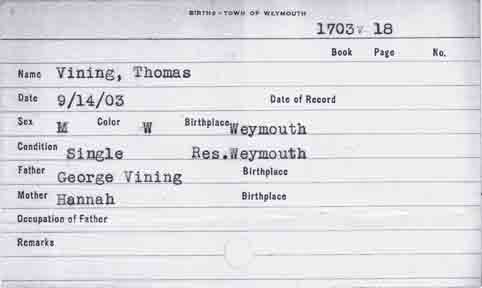 Birth record for Thomas Vining (from Weymouth, Massachusetts, town office):