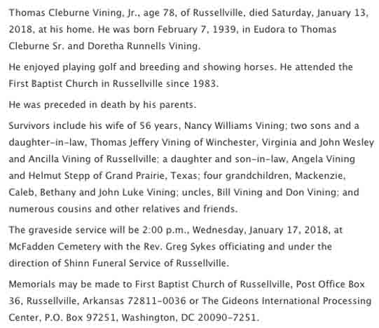 Obituary for Thomas Cleburne Vining Jr. (from website of Shinn Funeral Service, Russellville, Arkansas):