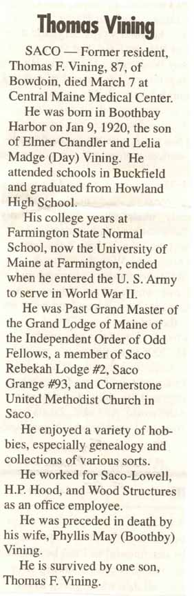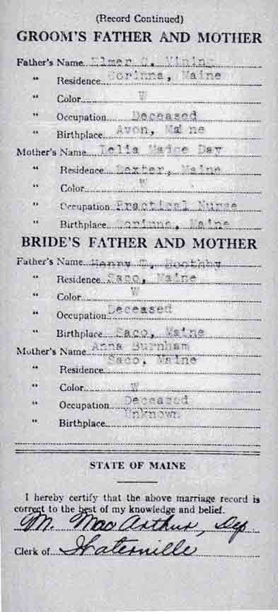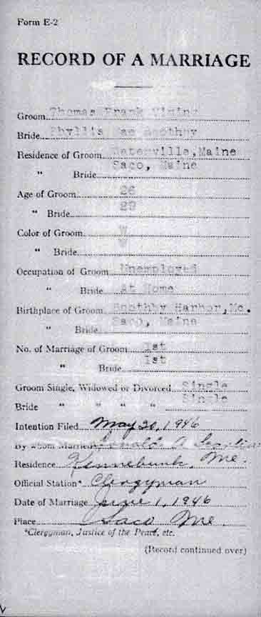 Marriage record for Thomas Frank Vining and Phyllis May Boothby (from Maine State Archives):