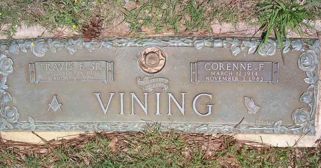 Headstone for Travis Franklin and Corenne (Farlow) Vining, in Westview Cemetery, Atlanta, Fulton County, Georgia (from Find A Grave):