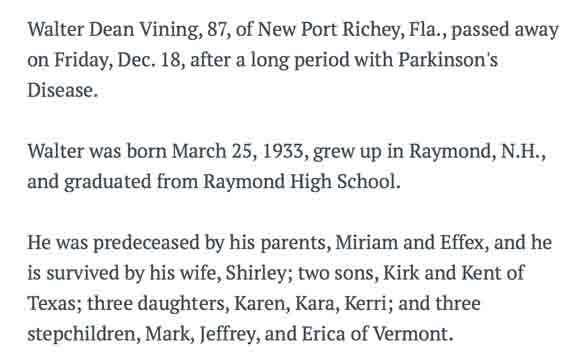 Obituary for Walter Dean Vining (from the New Hampshire Union Leader, 23 December 2020):