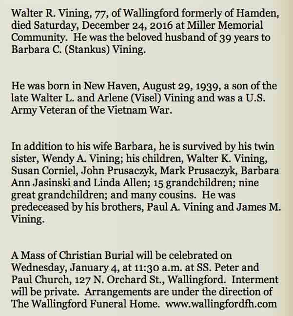 obituary for Walter R. Vining (from Wallingford Funeral Home website):
