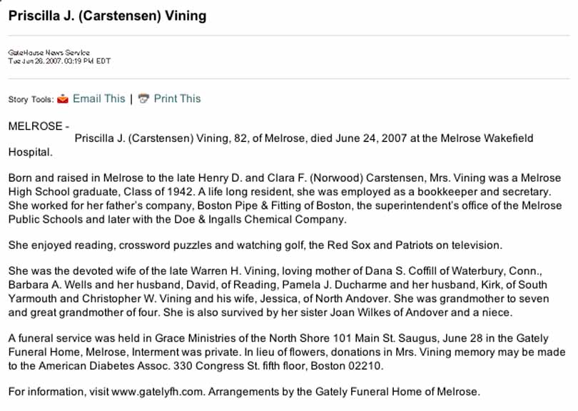 Obituary for Priscilla J. (Carstensen) Vining: