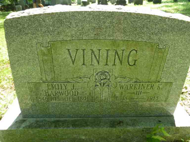 Headstone for Warriner King Vining and Emily Jane (Harwood) Vining, in Bozrah Cemetery, Hawley, Franklin County, Massachusetts: