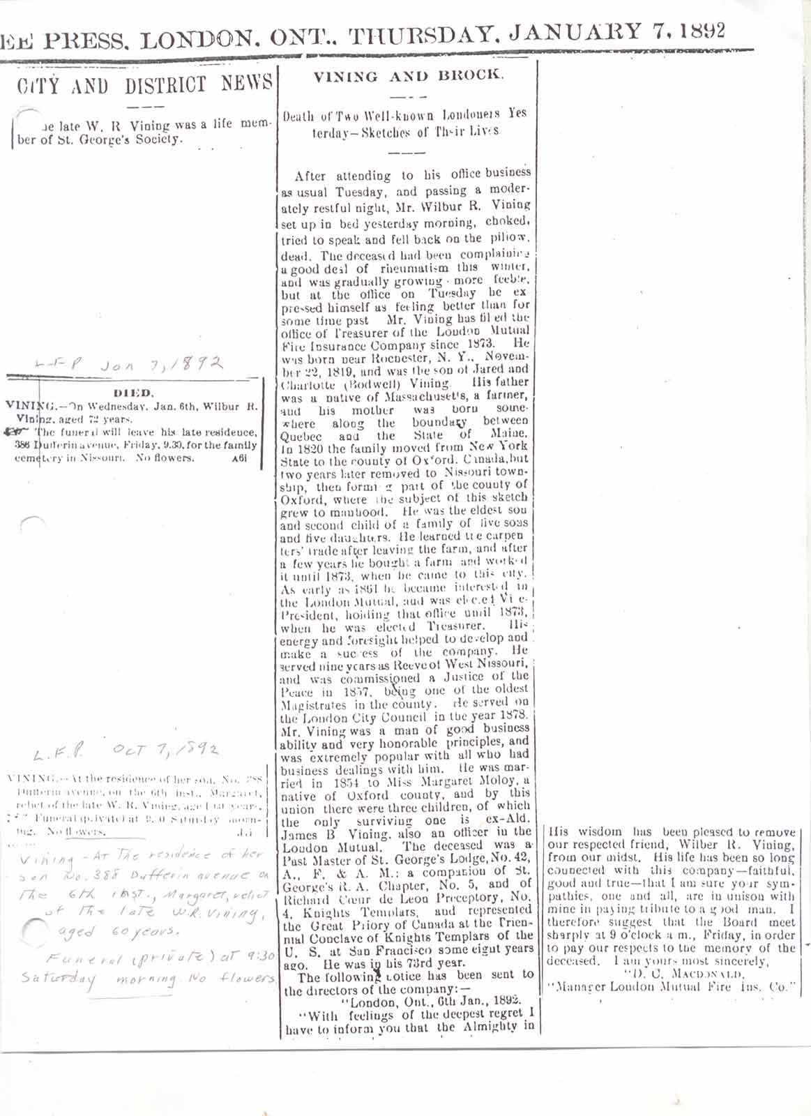 Obituary and death notice for Wilbur Records Vining: