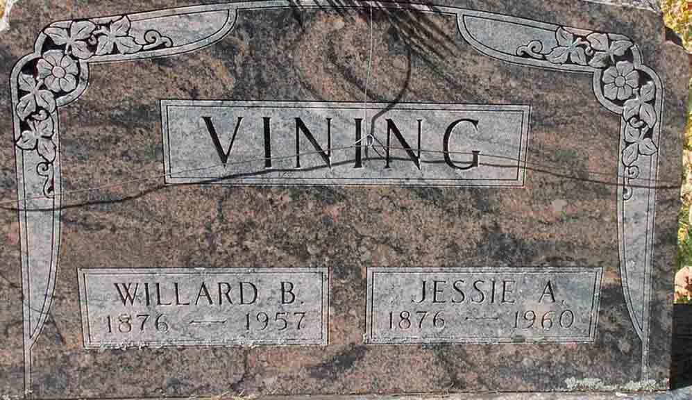 Headstone for Willard B. Vining and Jessie A. (Hitchcock) Vining, in Maplecrest Cemetery, Windham, Greene County, New York (from Find A Grave):