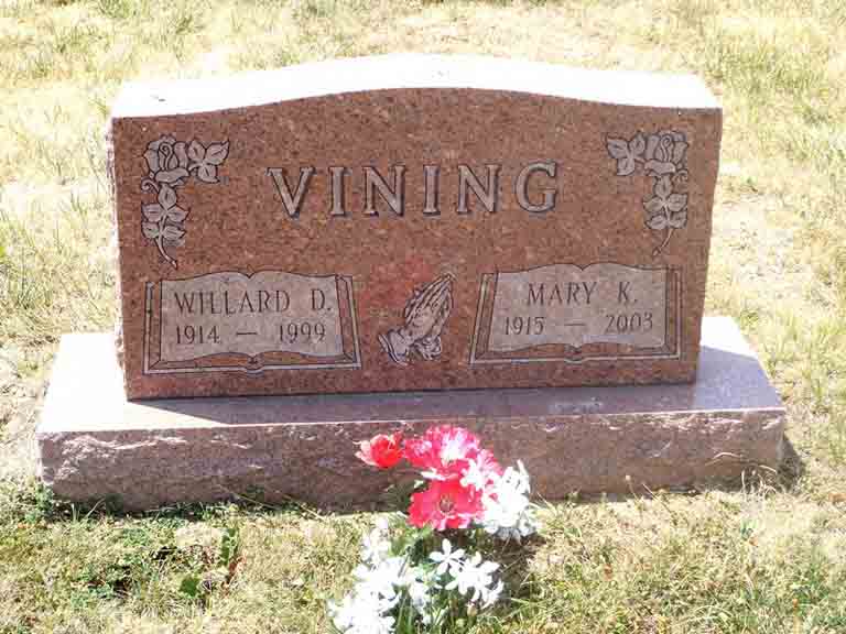 Headstone for Willard Devon Vining and Mary K. (Yocum) Vining, in Etna Green Cemetery, Etna Green, Kosciusko County, Indiana (from Find A Grave):