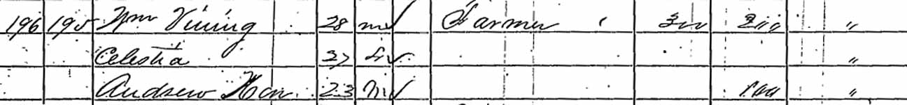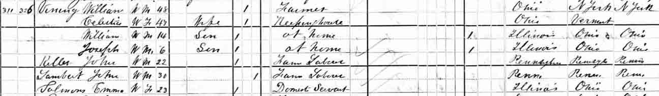 1880 Ross Township, Vermilion County, Ohio - dwelling 311, family 326. Also living in this household in 1880 were farm laborers John Keller (22 y., b. Pennsylvania) and John Lambert (30 y., b. Pennsylvania), and domestic servant Emma [Salmons?] (23 y., b. Illinoia).: