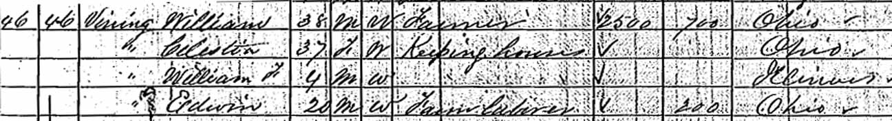 1870 Ross Township, Vermilion County, Ohio - dwelling 46, family 46. Also living in this household in 1870 was Edwin Vining (20 y., b. Ohio), a farm laborer.: