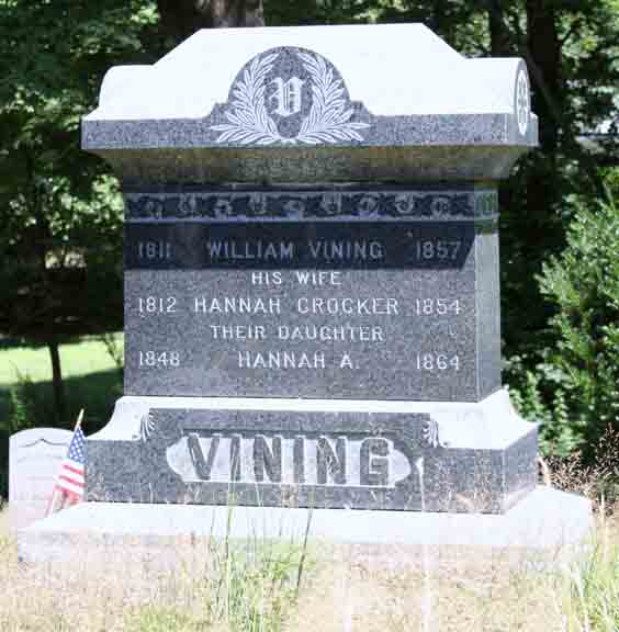 Headstone for William Vining, Hannah (Crocker) Vining, and daughter Hannah Abigail Vining, in Maplewood Cemetery, Rockland, Plymouth County, Massachusetts (from Find A Grave):