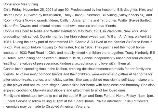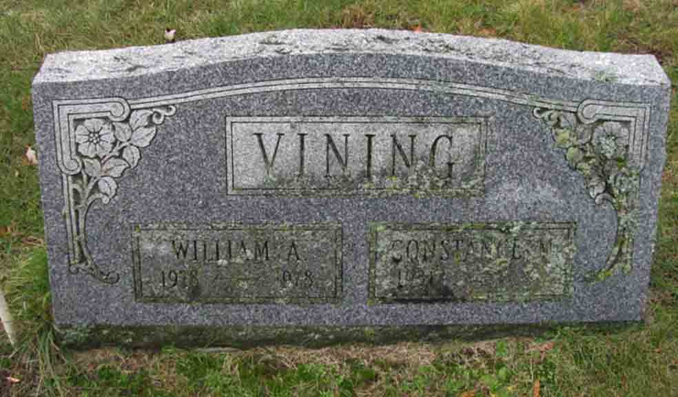 Headstone for William Albert Vining and Constance (Bartlett) Vining, in Grove Place Cemeter, Chili Center, Monroe County, New York (from Find A Grave):