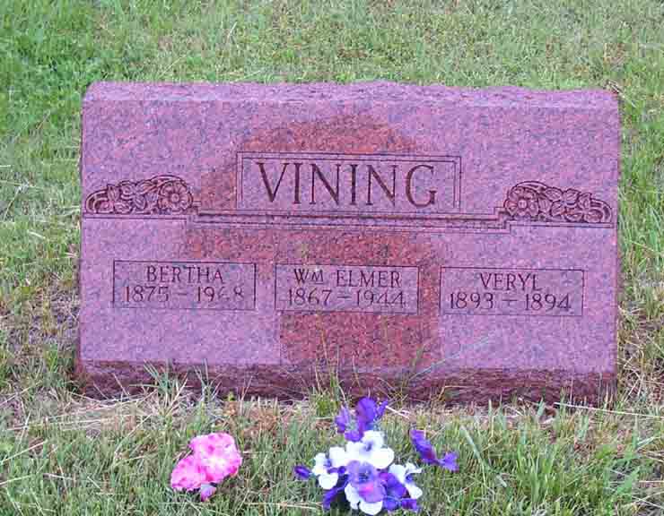 Headstone for William Elmer Vining, Bertha (Woodruff) Vining, and daughter Veryl Vining, in Deaver Cemetery, Furnas County, Nebraska (from Find A Grave):