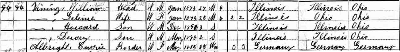 1900 Limestone, Kankakee County, Illinois - dwelling 97, family 97. Also living in this household in 1900 was “boarder” Carrie Albright (85 y., b. Germany), likely the mother of Glennie Albright.: