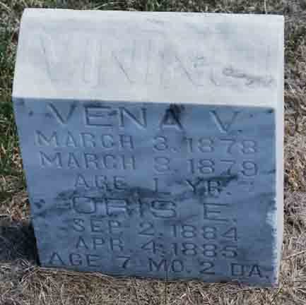 Headstone for Vena Viola and Oris Ella Vining, daughters of William Harmon Vining and Sarah Margaret (Ridenour) Vining, in Deaver Cemetery, Precept, Furnas County, Nebraska (from Find A Grave):