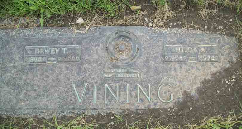 Headstone for Dewey Theodore Vining and wife Hilda A. […], son and daughter-in-law of William Hallet Vining and Harriet […], in Kankakee Memorial Gardens and Chapel Mausoleum, Kankakee, Kankakee County, Illinois (from Find A Grave):