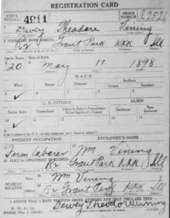 Dewey Theodore Vining was of medium height and medium build when he registered on 12 September 1918 for service in World War I.