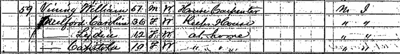 1870 Mannington Township, Salem County, New Jersey - dwelling 55, family 59. Also living in this household in 1870 were Caroline [...]elford (to become the wife of William H. Vining, 36 y., b. New Jersey) and her two children [of more?] Lydia [...]elford (12 y., b. New Jersey) and Capitola [Capitolia in 1880] [...]elford (10 y., b. New Jersey). Presumably as a result of the 1862 death of their mother, (at least) three of William H. and Abigail H. ([...]) Vining's children moved to other households and were reported from them in the 1870 census: William H. Vining (Mannington Township, Salem County, New Jersey - dwelling 86, family 89), Thomas Roan Vining (Upper Alloways Creek, Salem County, New Jersey - dwelling 236, family 232), and Levi D. Vining (Elsinboro, Salem County, New Jersey - dwelling 115, family 118).: