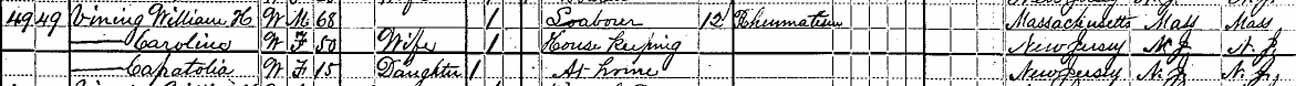 1880 Salem (west ward), Salem County, New Jersey - dwelling 49, family 49. By 1880, Caroline [...]elford was the wife of William H. Vining, and Capatolia had taken on the surname of Vining.: